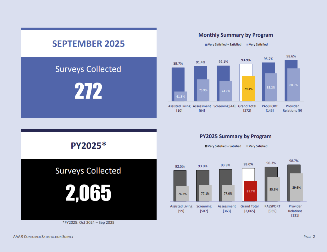 This report presents a comprehensive analysis of Consumer Satisfaction Survey (CSS) responses gathered each month. The report will be updated once a quarter. It reflects feedback from individuals served through key programs at AAA9, including: